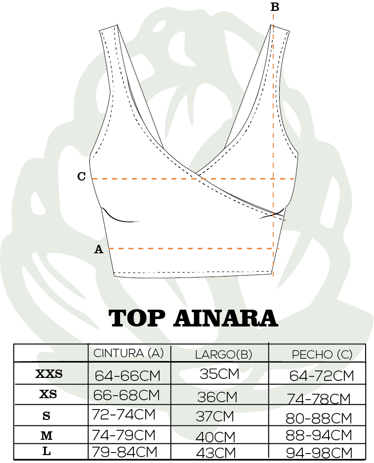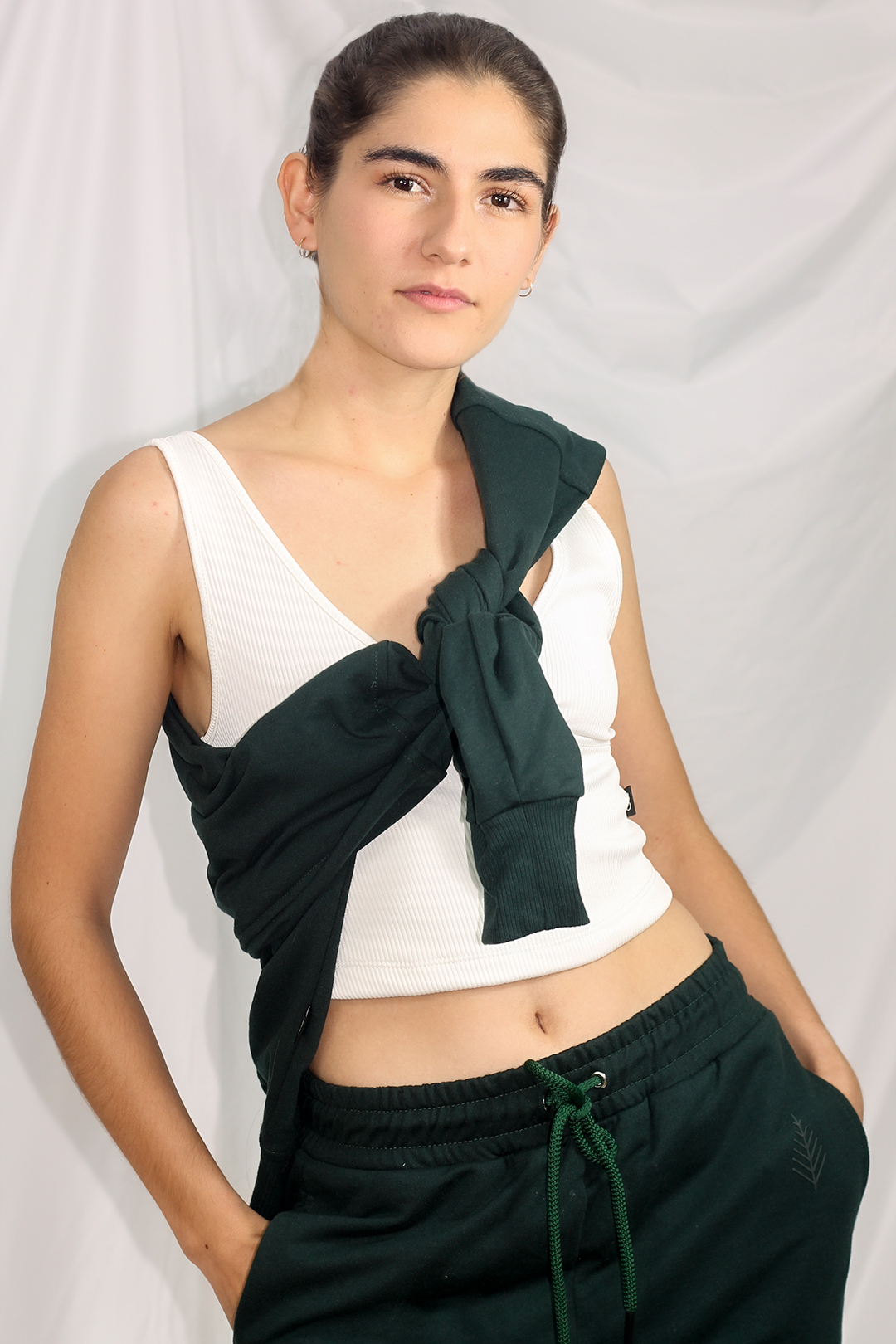 Top largo cruzado con tiras, elaborado con rib grueso 92% poliester y 8% spandex;marquilla, talla y etiqueta 100% eco.