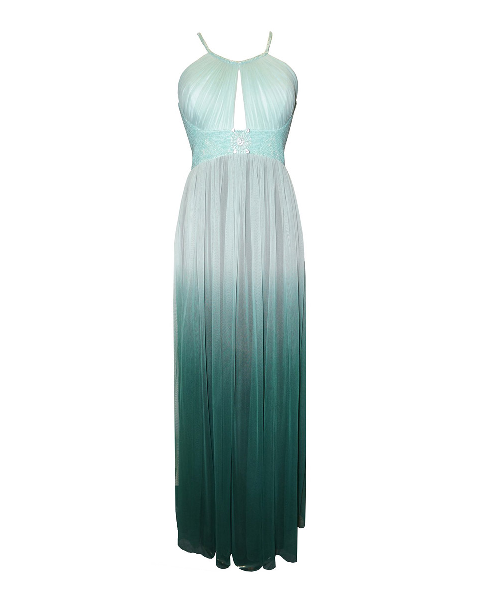 Vestido en tul desgradado, con detalle de predería en cintura y escote con espalda cruzada de la Colección de Carla Ruiz. Sólo disponible en rosa.