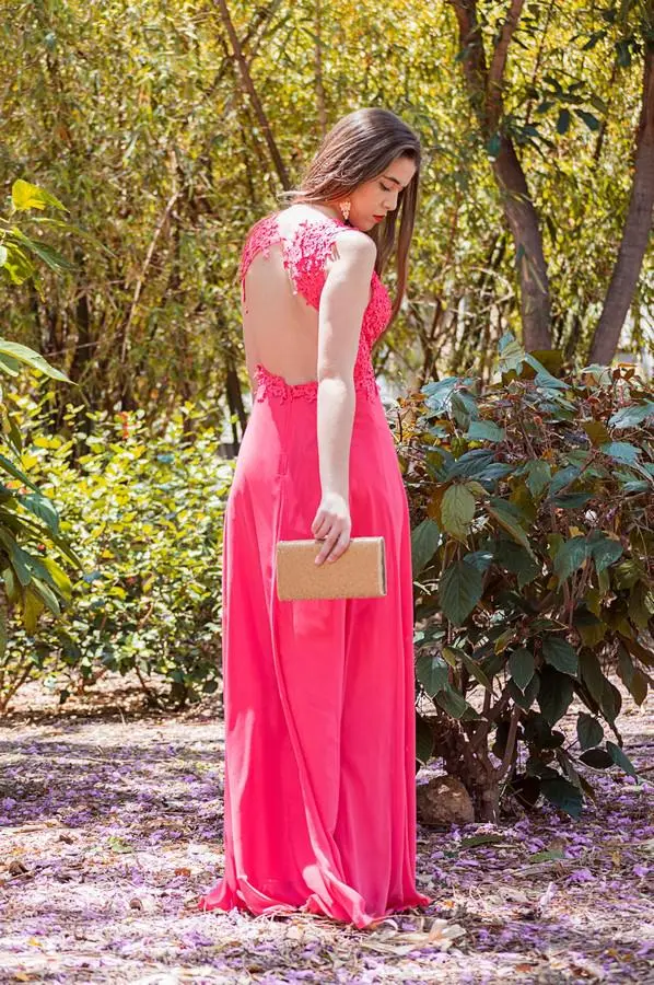 Vestido con espalda al aire top de guipur y falda de crepé