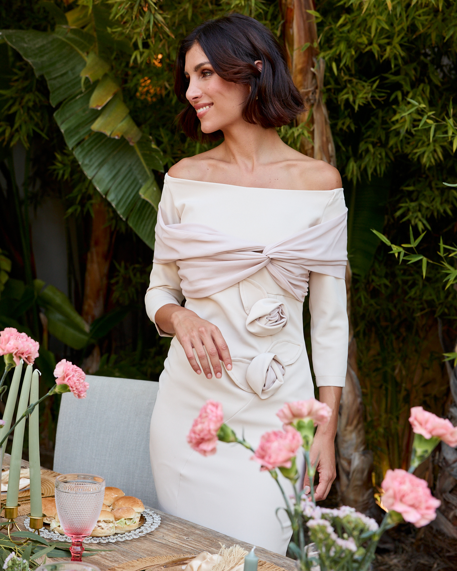 Vestido comido color beige cuello barco con detalles de flores.