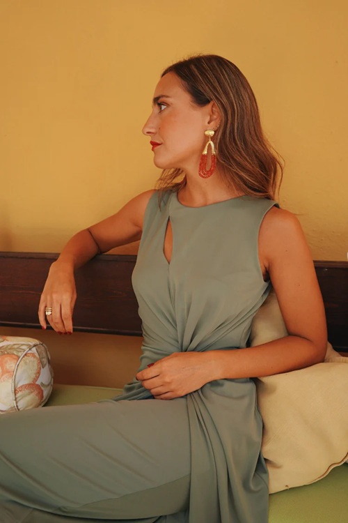 Vestido liso sin mangas con abertura en el pecho en punto de seda de la Colección Icíar y Candela.