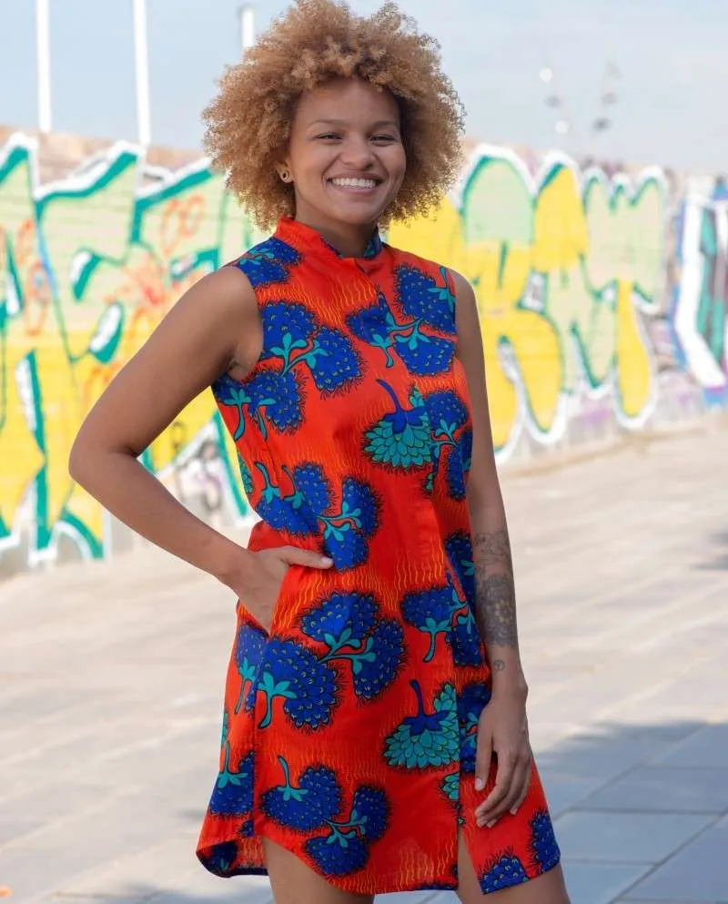 Vestido camisero recto sin mangas, cuello mao y bolsillos laterales invisibles.