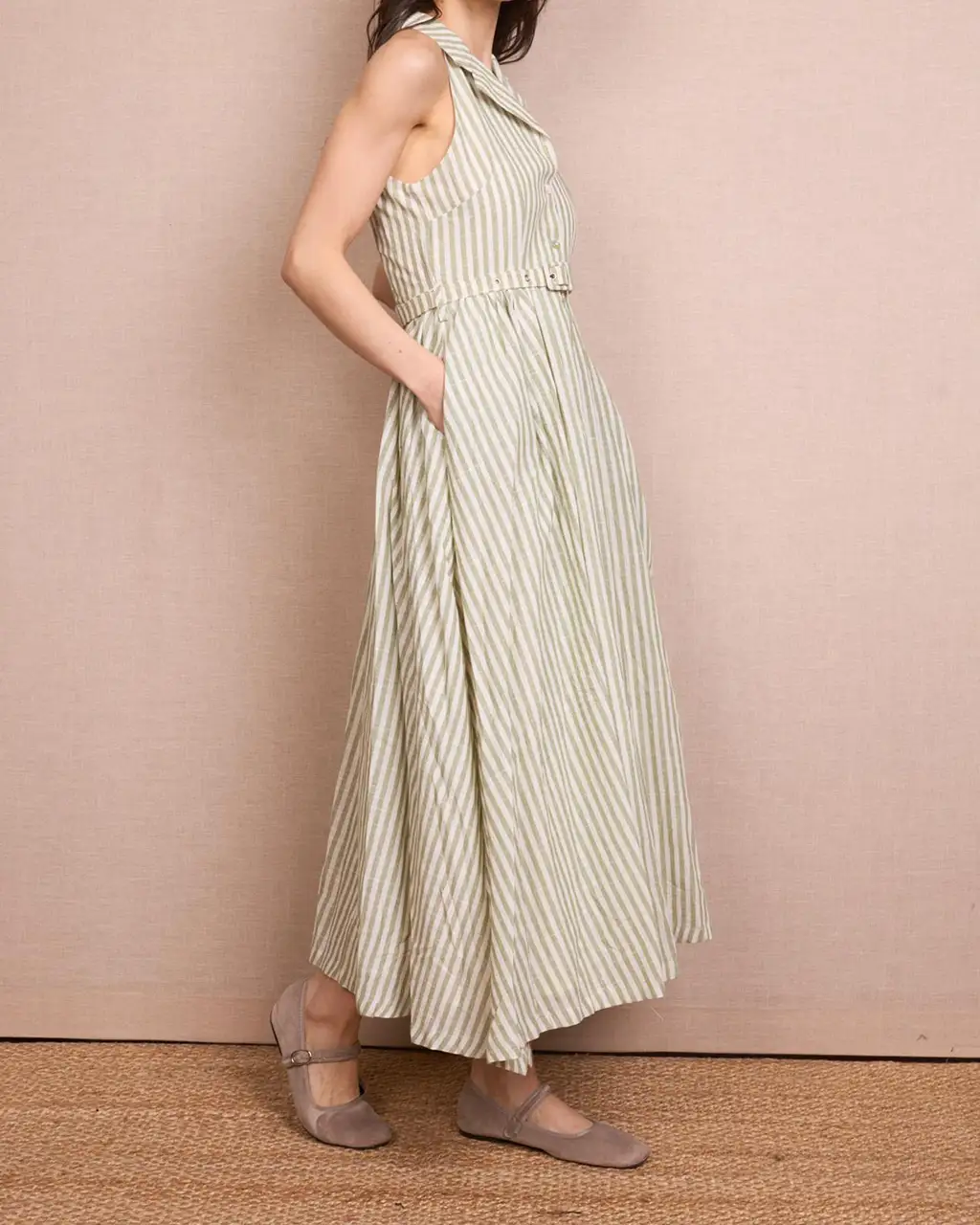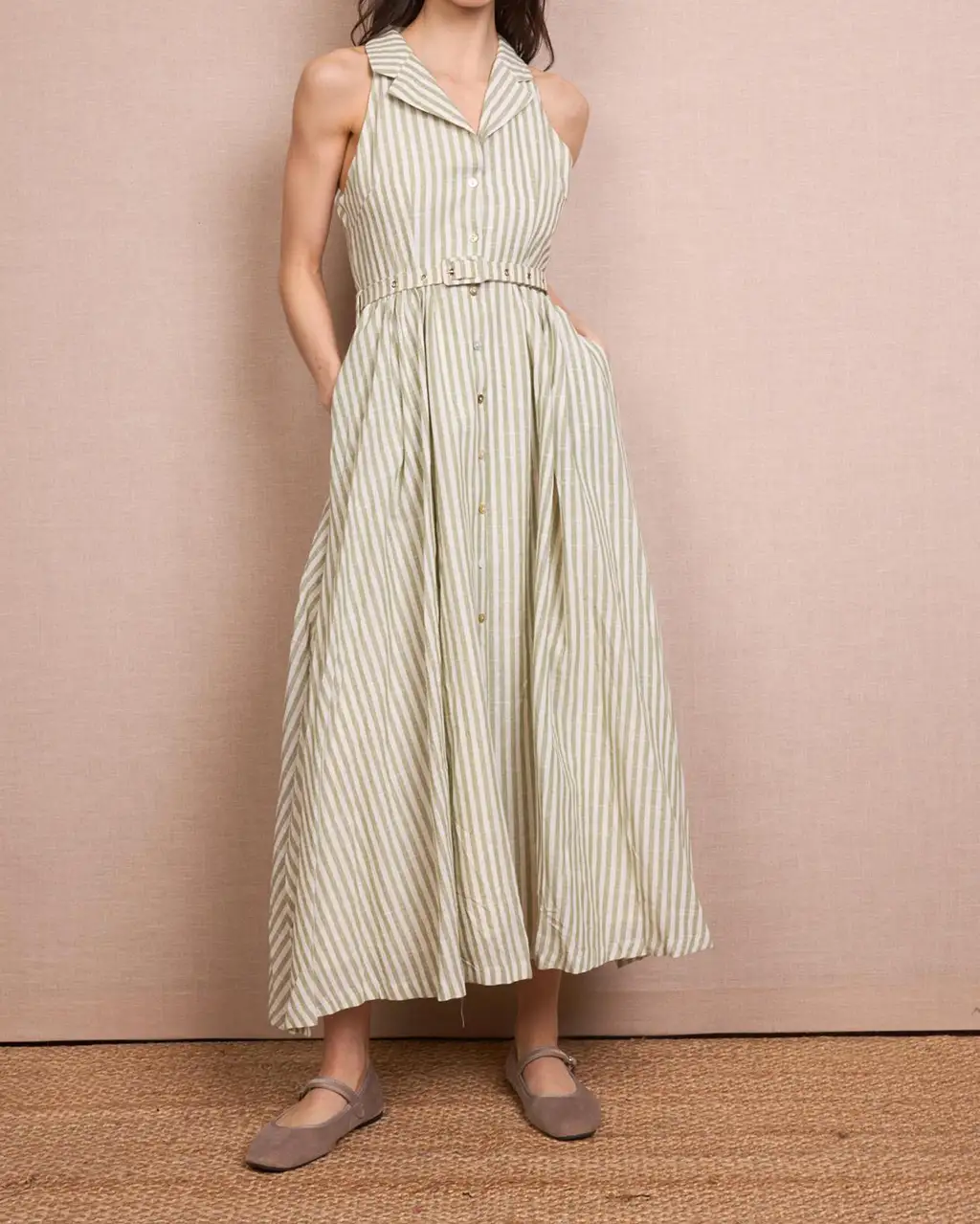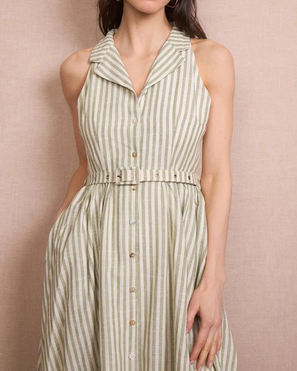 Vestido camisero fabricado en lino y algodón color kaki. Disponible en diferentes tallas.