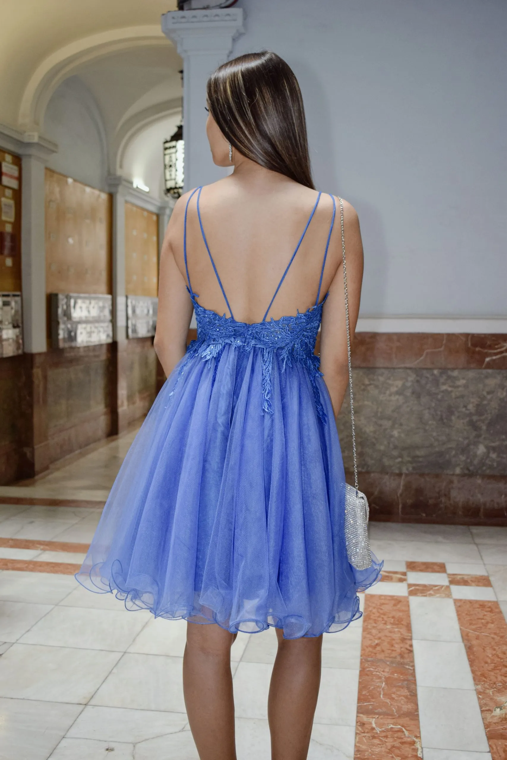 Vestido con top de guipur y apliques de strass y falda con múltiples capas de tul