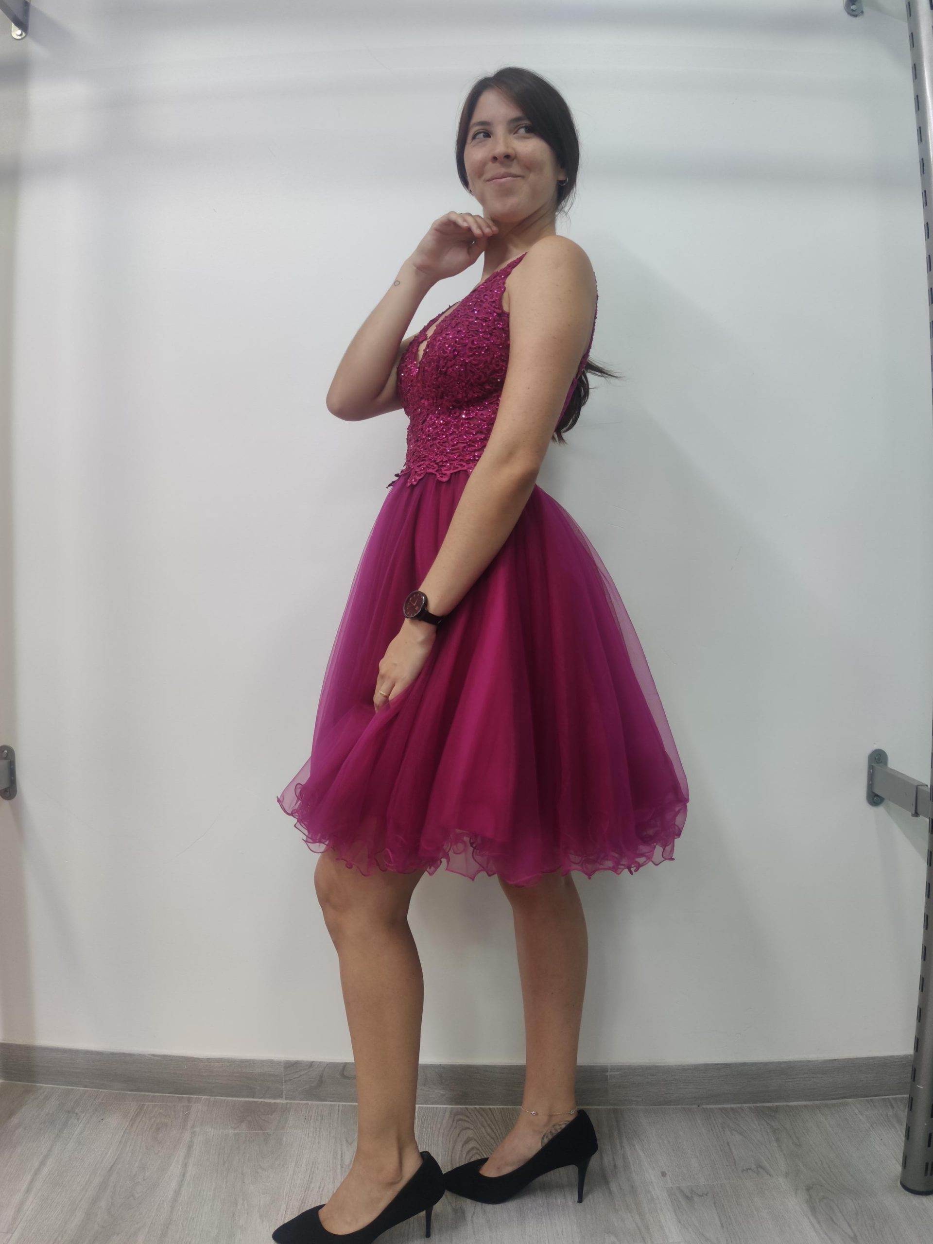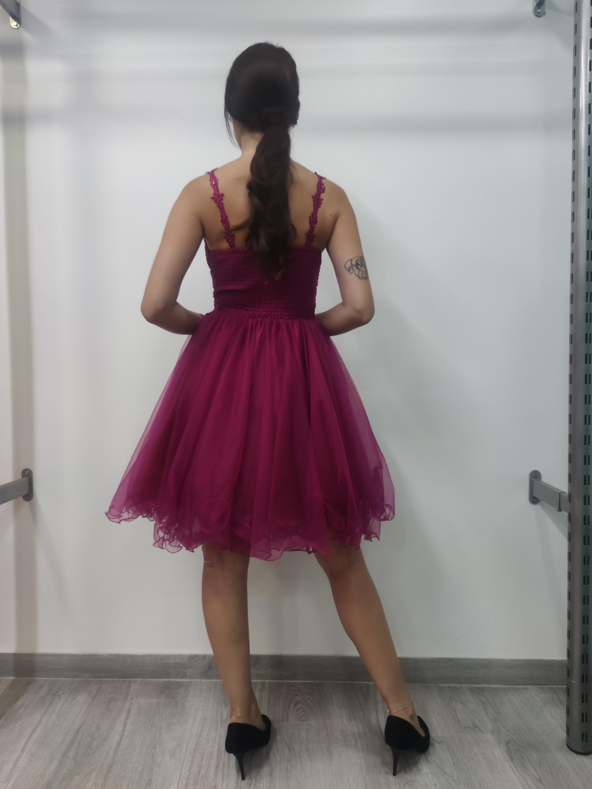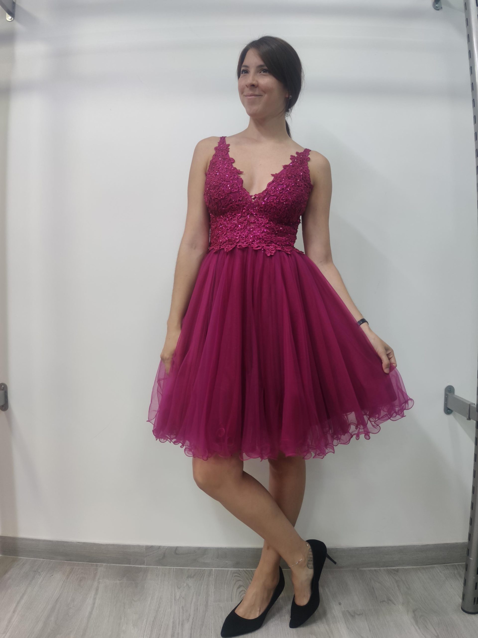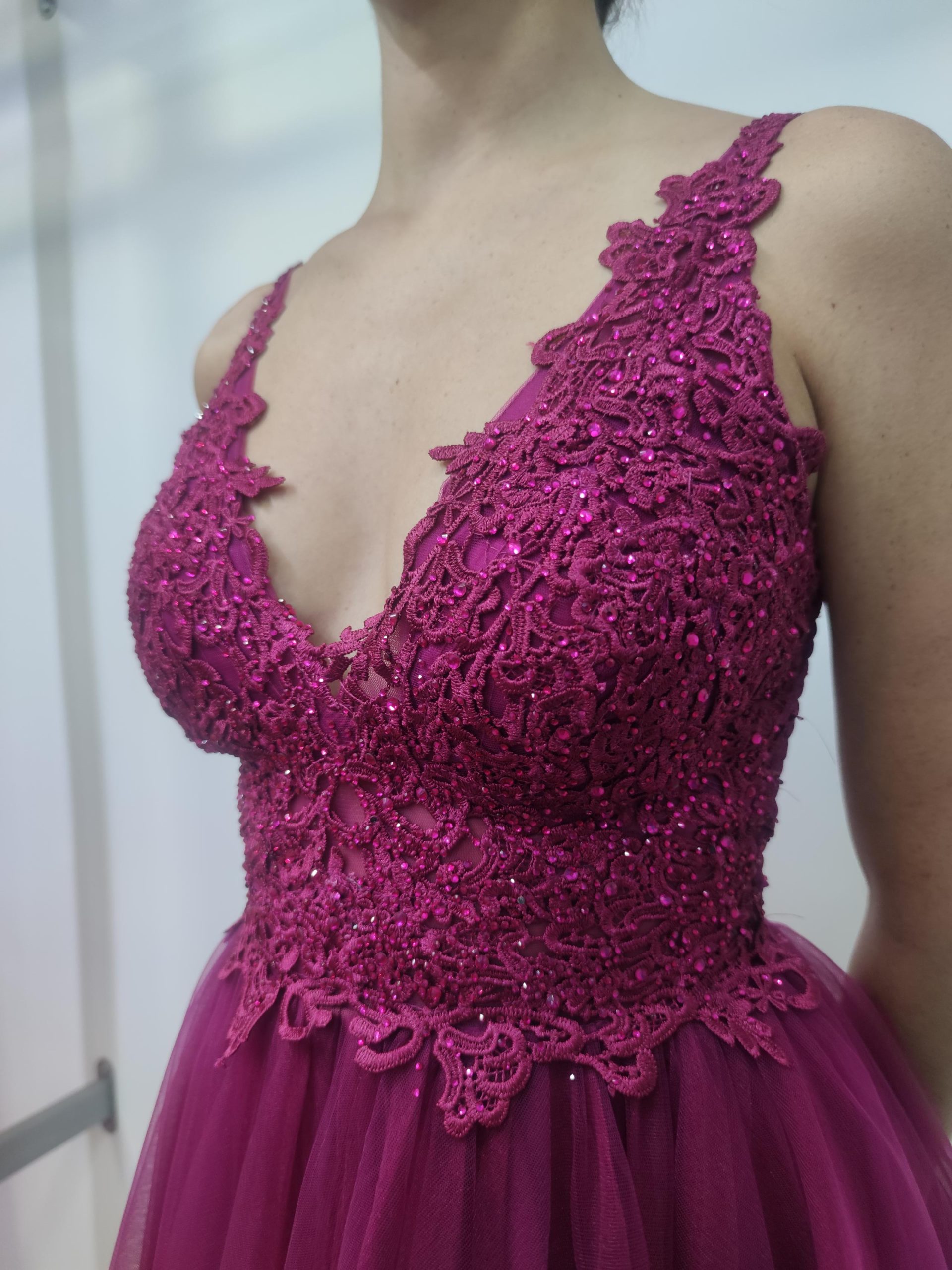 Precioso vestido con cuerpo de guipour y piedrecitas del mismo tono, escote pico y tirante fino. Espalda con panal de abeja, lo que hace que se amolde muy bien al talle. Falda con 2 capas de tul, más 2 de forro.