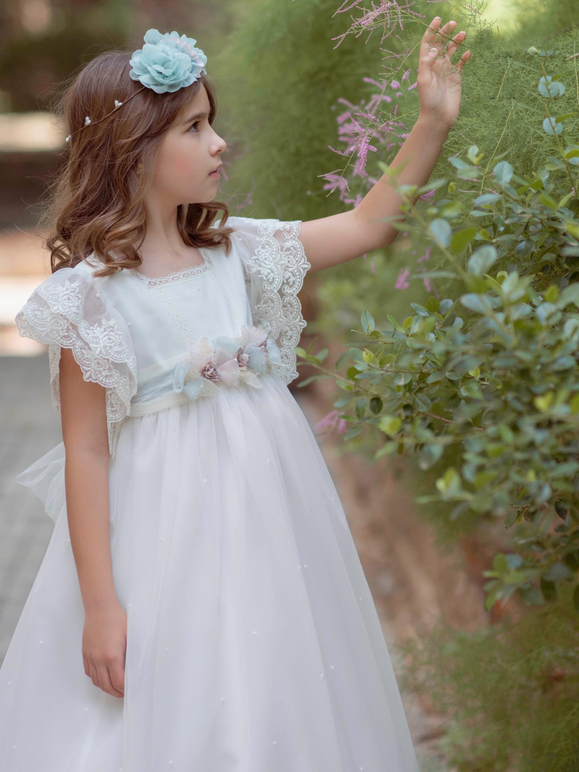 Vestido de comunión confeccionado en plumeti, y mangas voladas de plumiti bordado, escote cuadrado y delicada cenefa de encaje en el pecho y alrededor del escote, fajín de tul de seda y cristal con prendido artesanal de flor.