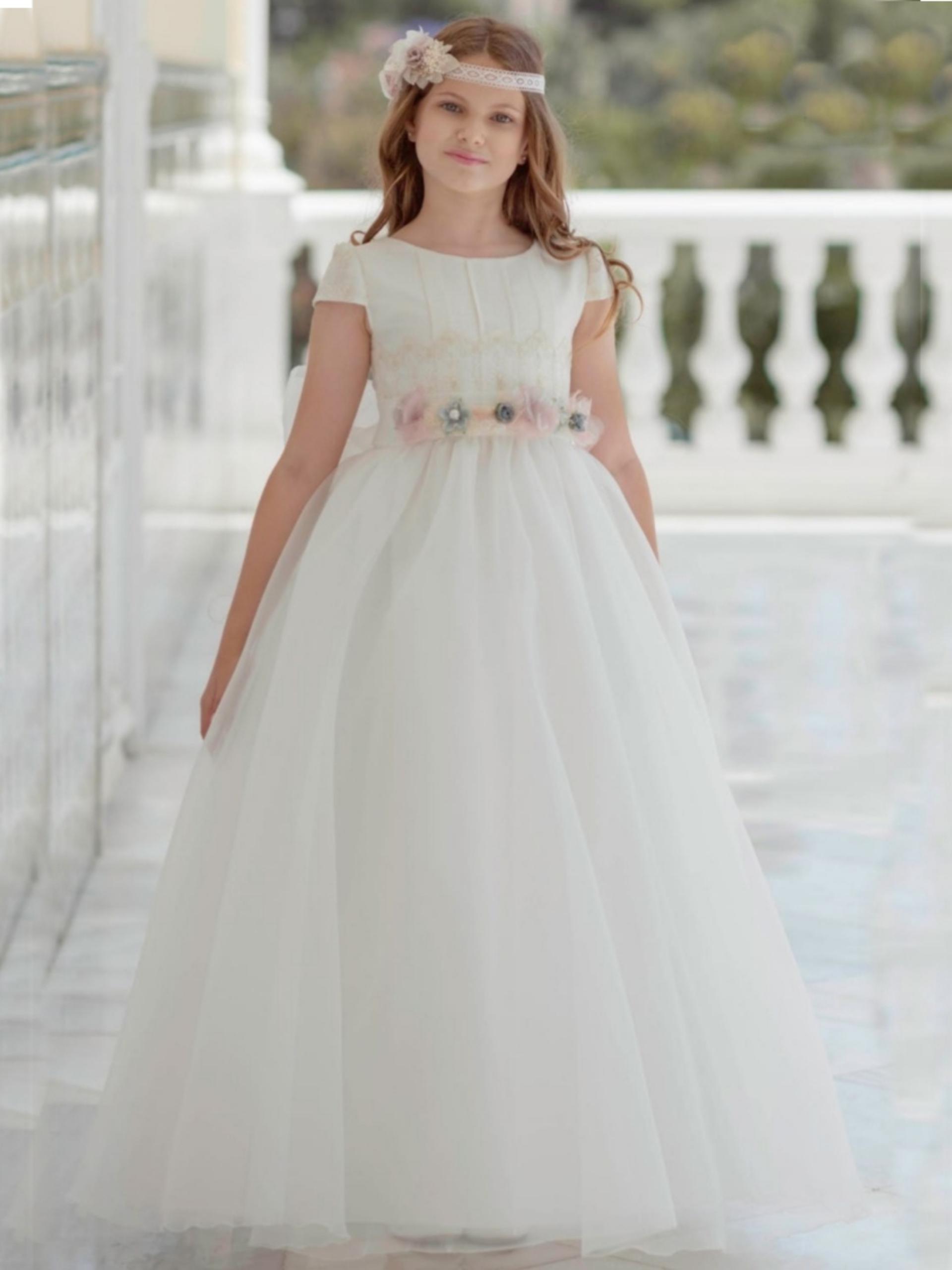 Vestido de comunión con falda confeccionada en organza cristal, y cuerpo de lino dulce rayado, con delicado encaje en la parte alta de la cintura y mangas, cinturón con flores secas en tonos rosas y azules.