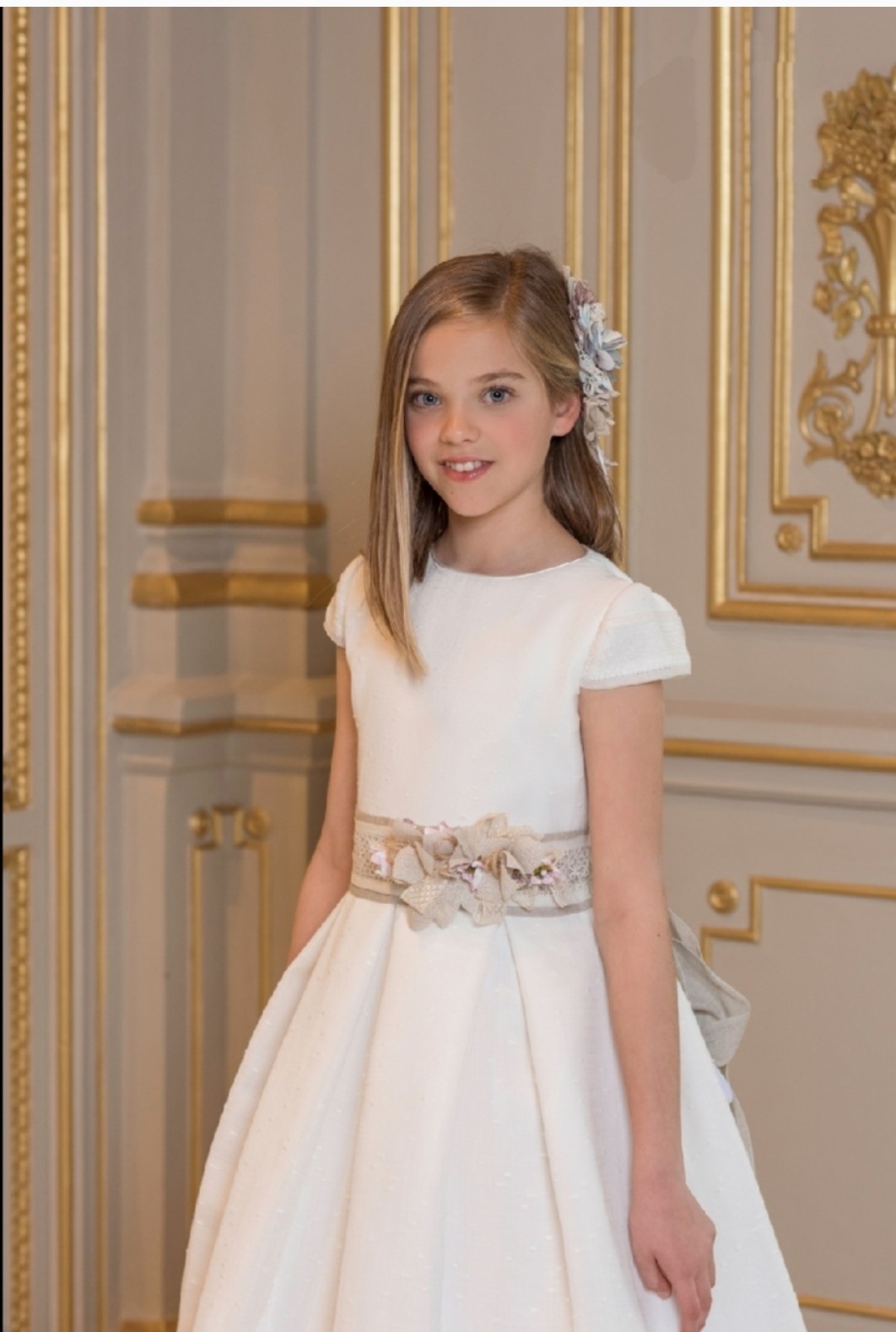 Vestido de comunión confeccionado en lino haciendo. topos, falda de tablas y cuerpo con escote redondeado y manga corta, luce un cinturón rustico en tonos arena al igual que la flor de la cintura. Confeccionado a medida.