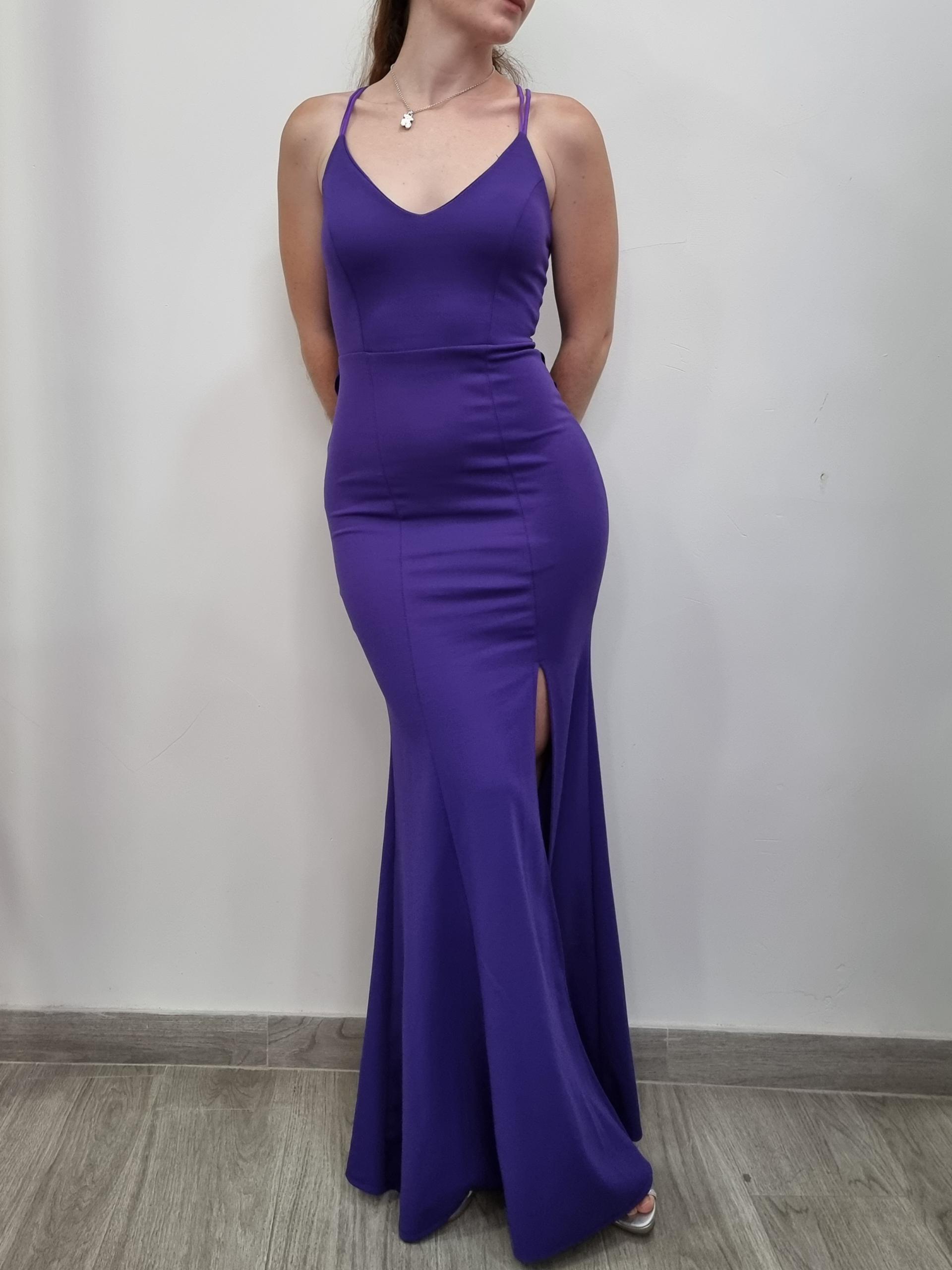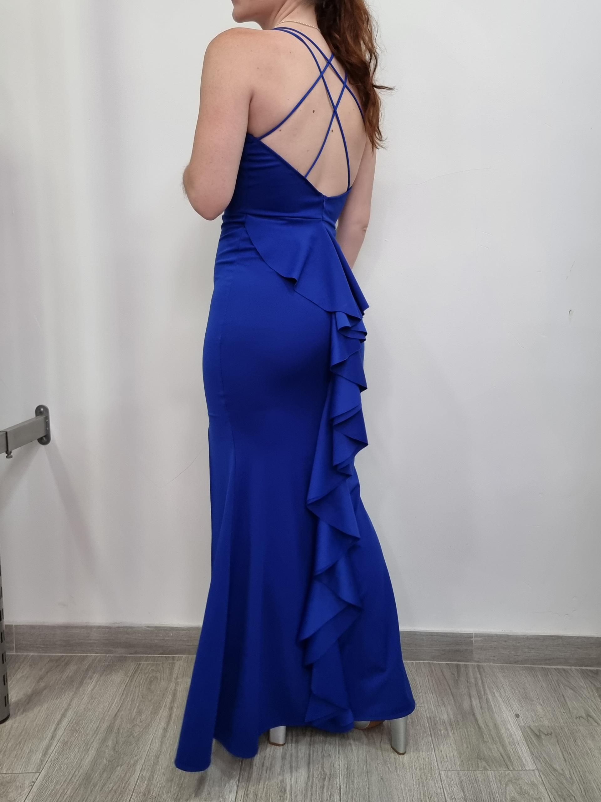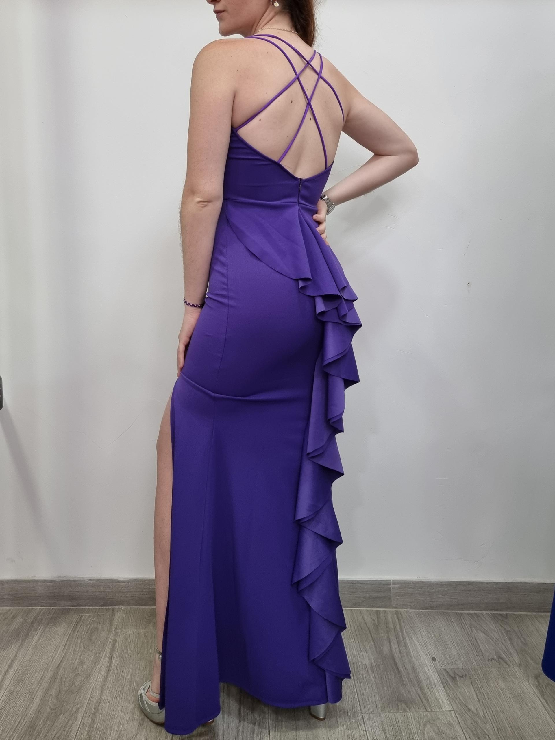 Vestido de fiesta de corte sirena, de licra con escote en la espalda y volante caído, dobles tirantes cruzados. Con abertura.