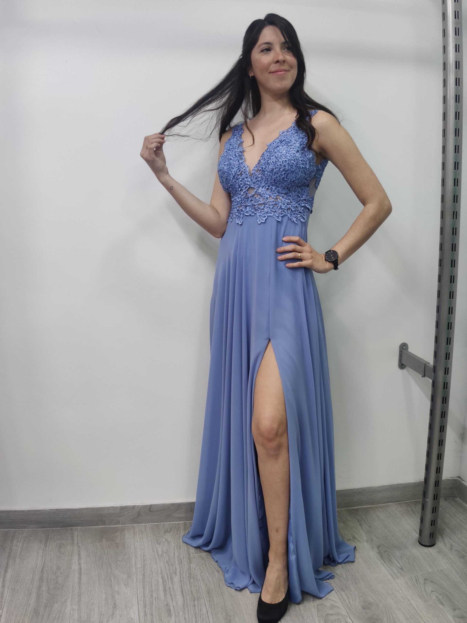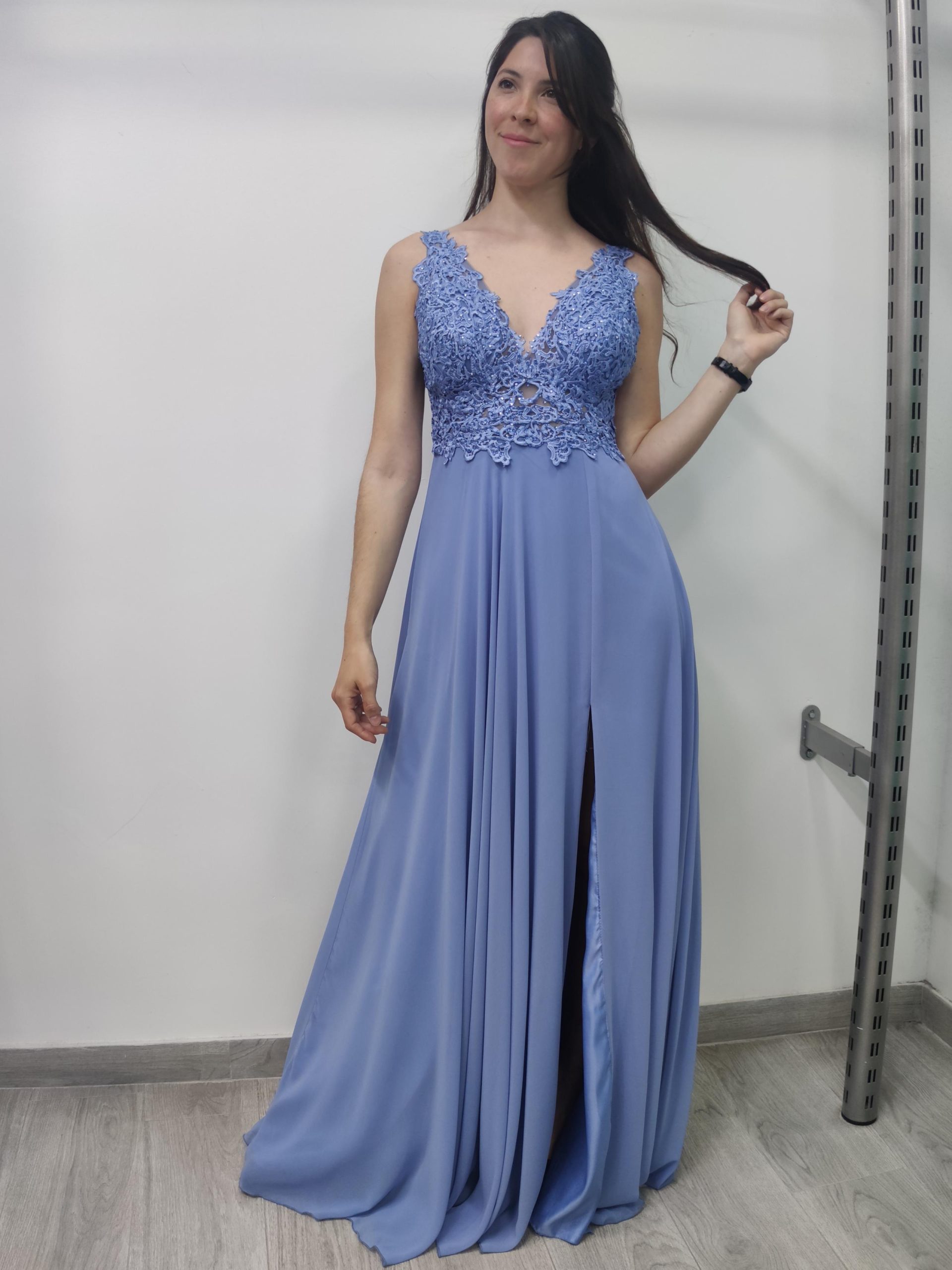 Vestido largo de fiesta, con cuerpo de guipour y fina pedrería, con cazuelas, escote bajo en la espalda con delicada transparencia, con falda de vuelo y abertura lateral. tirante fino en escote V.