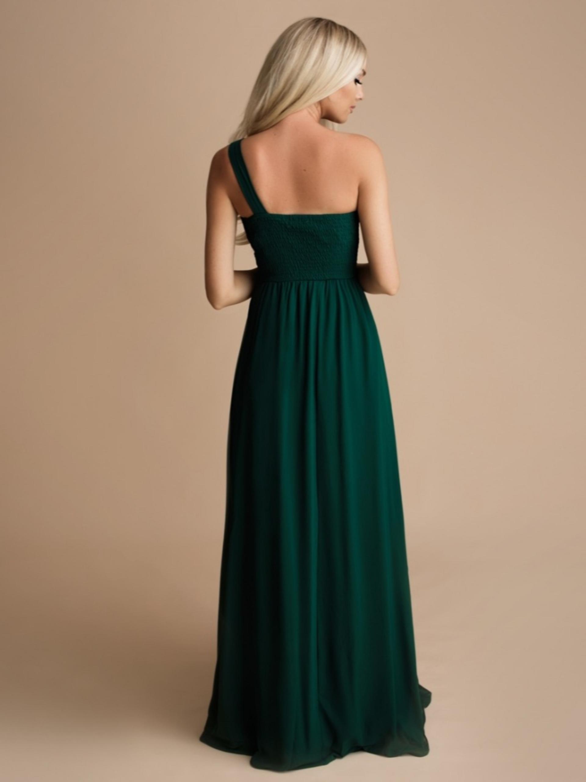 Vestido largo de gasa, de un tirante, con cuerpo drapeado y cintura también drapeado en diferente sentido, resaltando así más la cintura, falda de vuelo y espalda de panal de abeja, que lo hace muy cómodo de llevar.