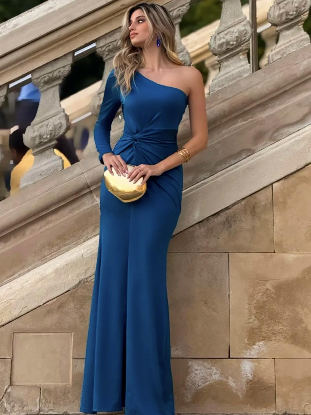 Vestido satinado asimétrico con detalle nudo en cadera muy favorecedor, abertura en la pierna. Cremallera invisible.