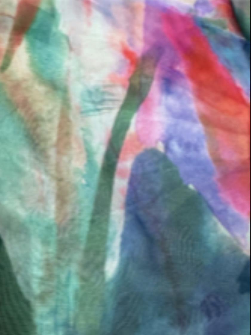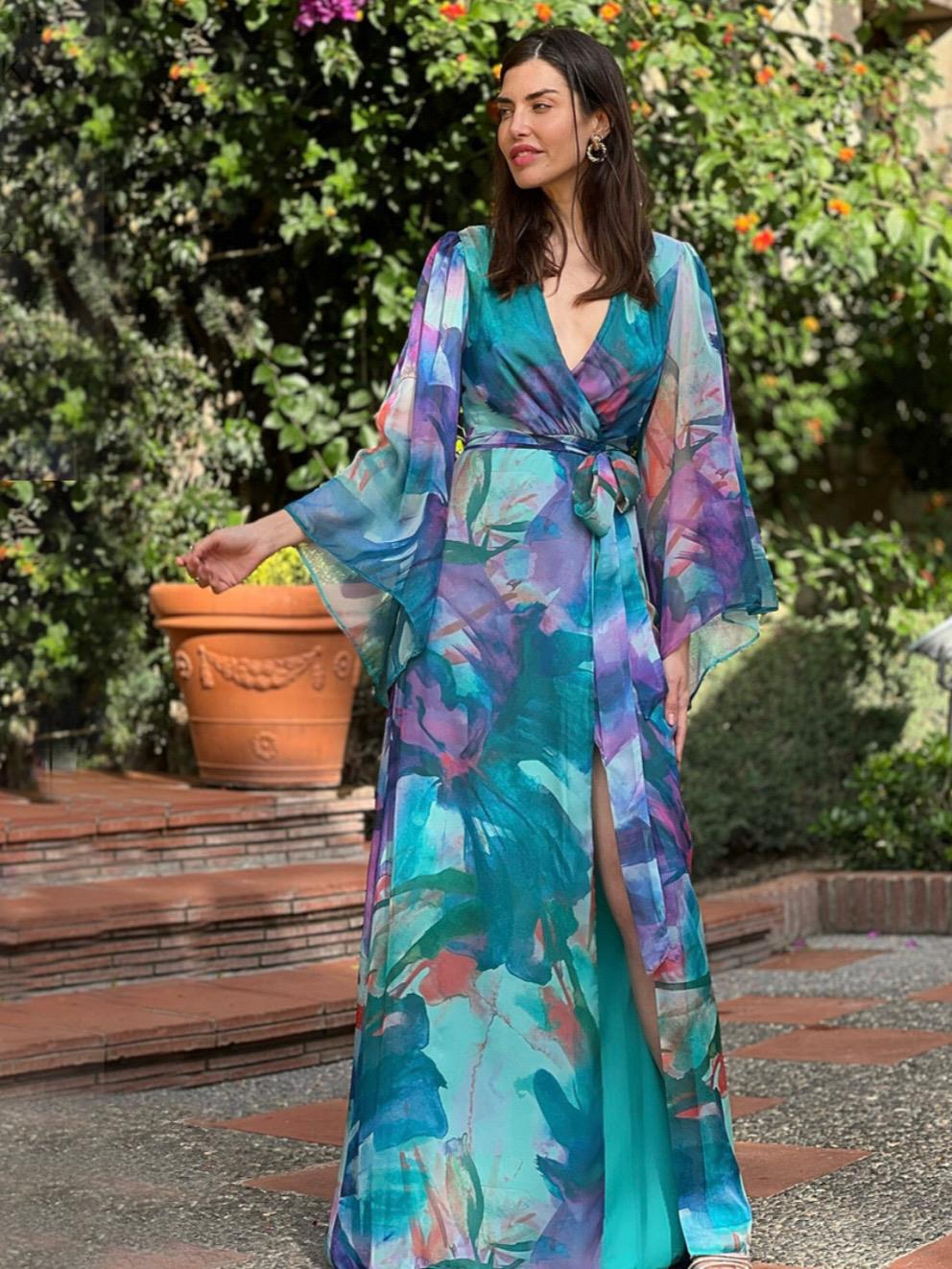 Vestido de gasa con precioso estampado, mangas murciélago, de escote cruzado y cinturón del mismo tono. Cremallera invisible. Forrado.