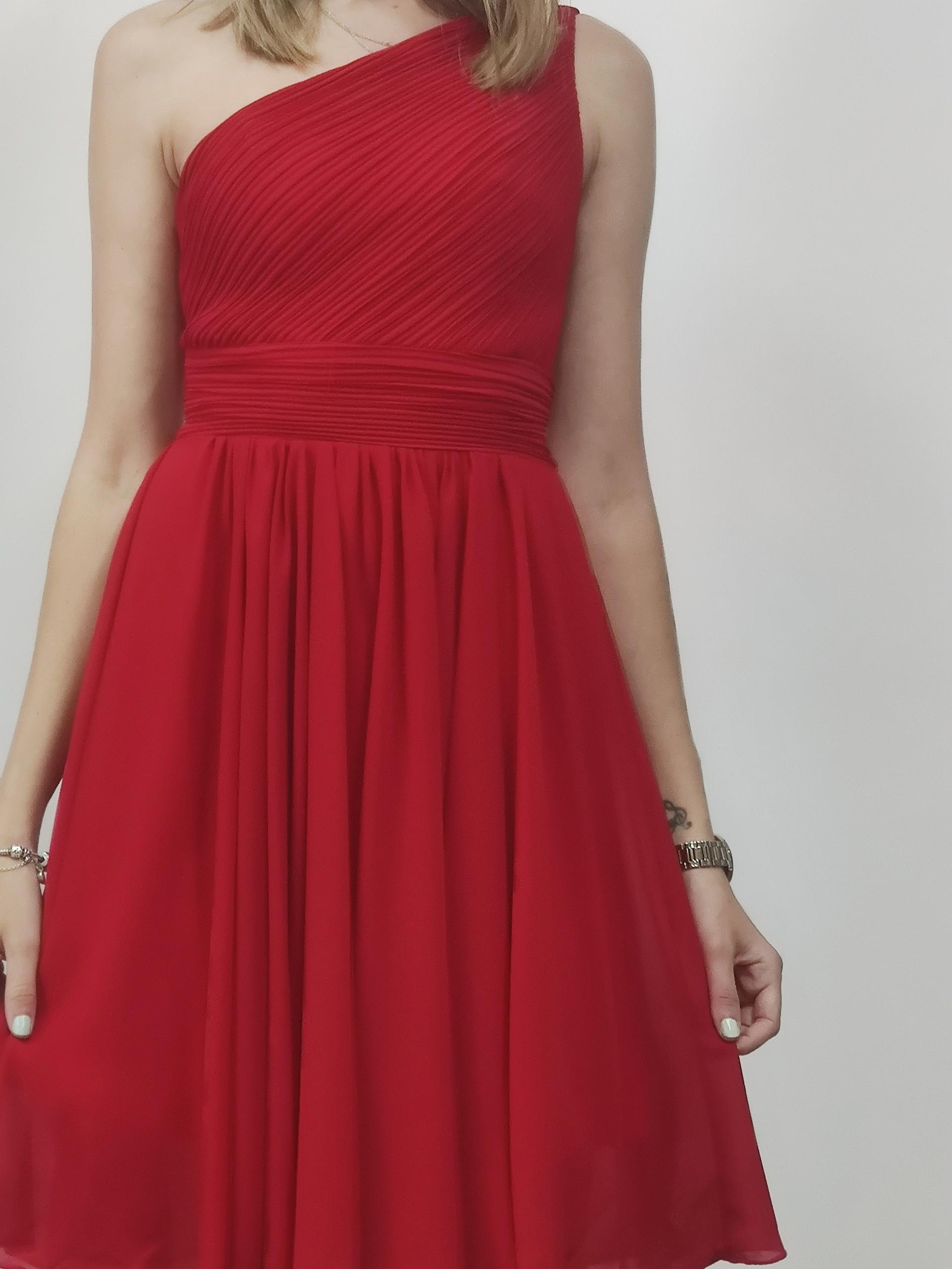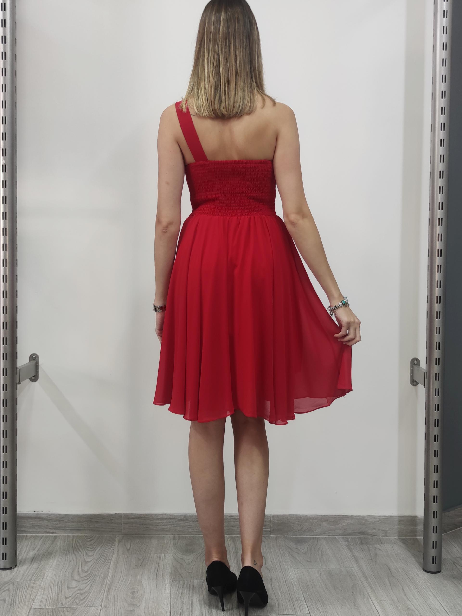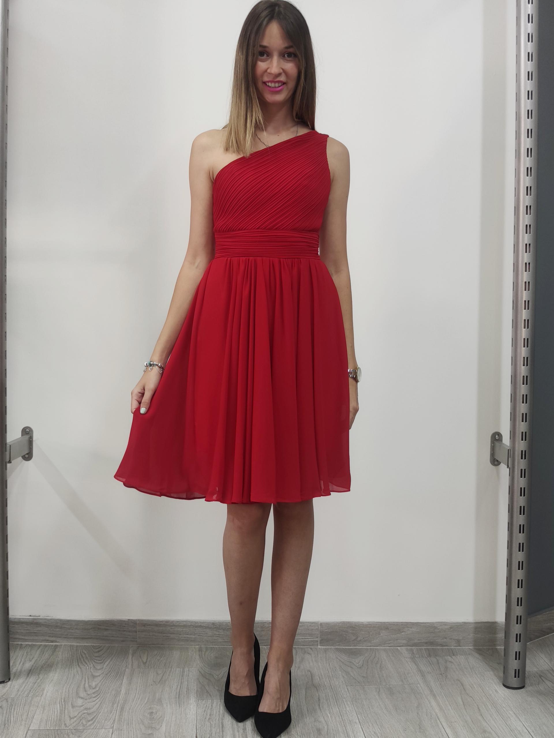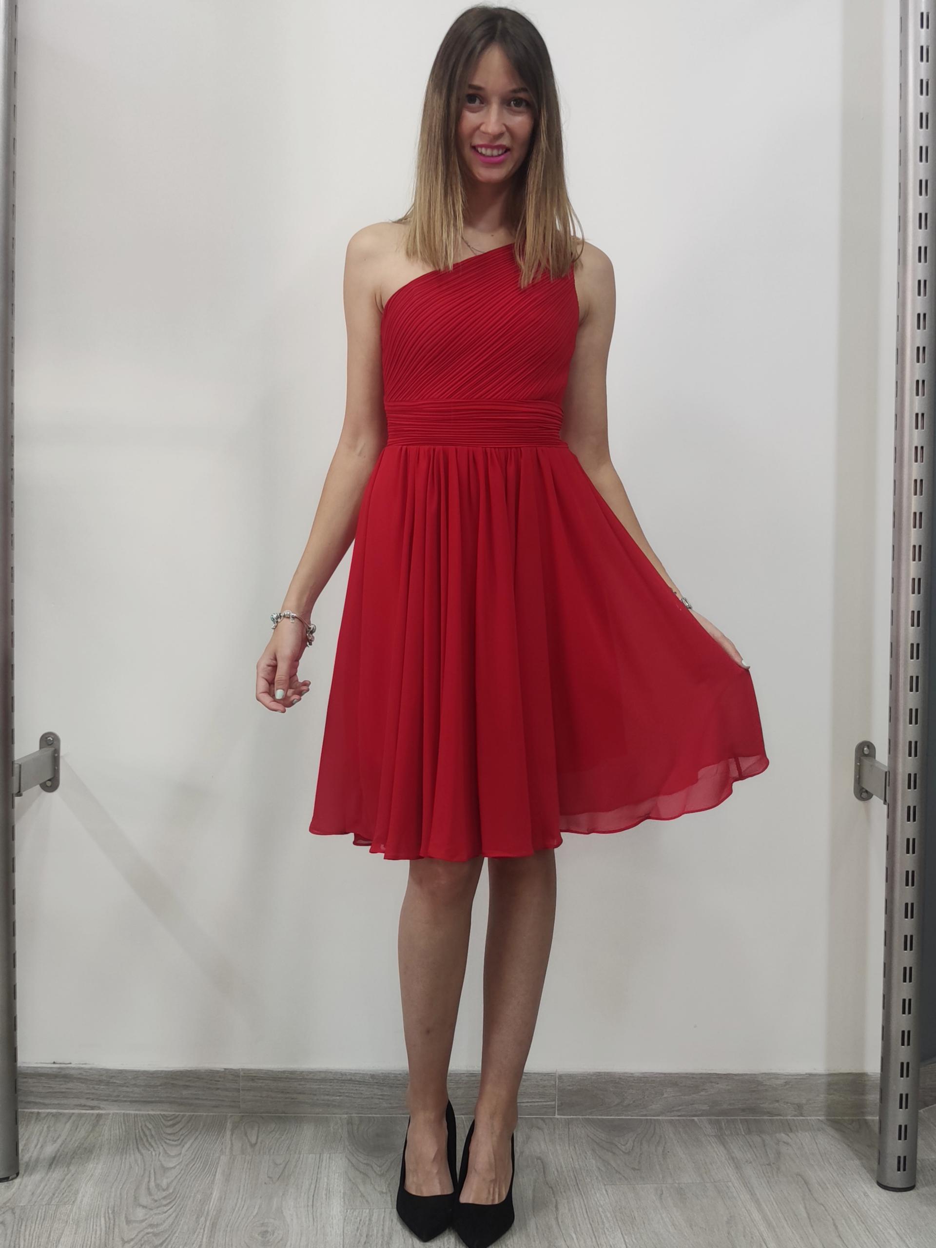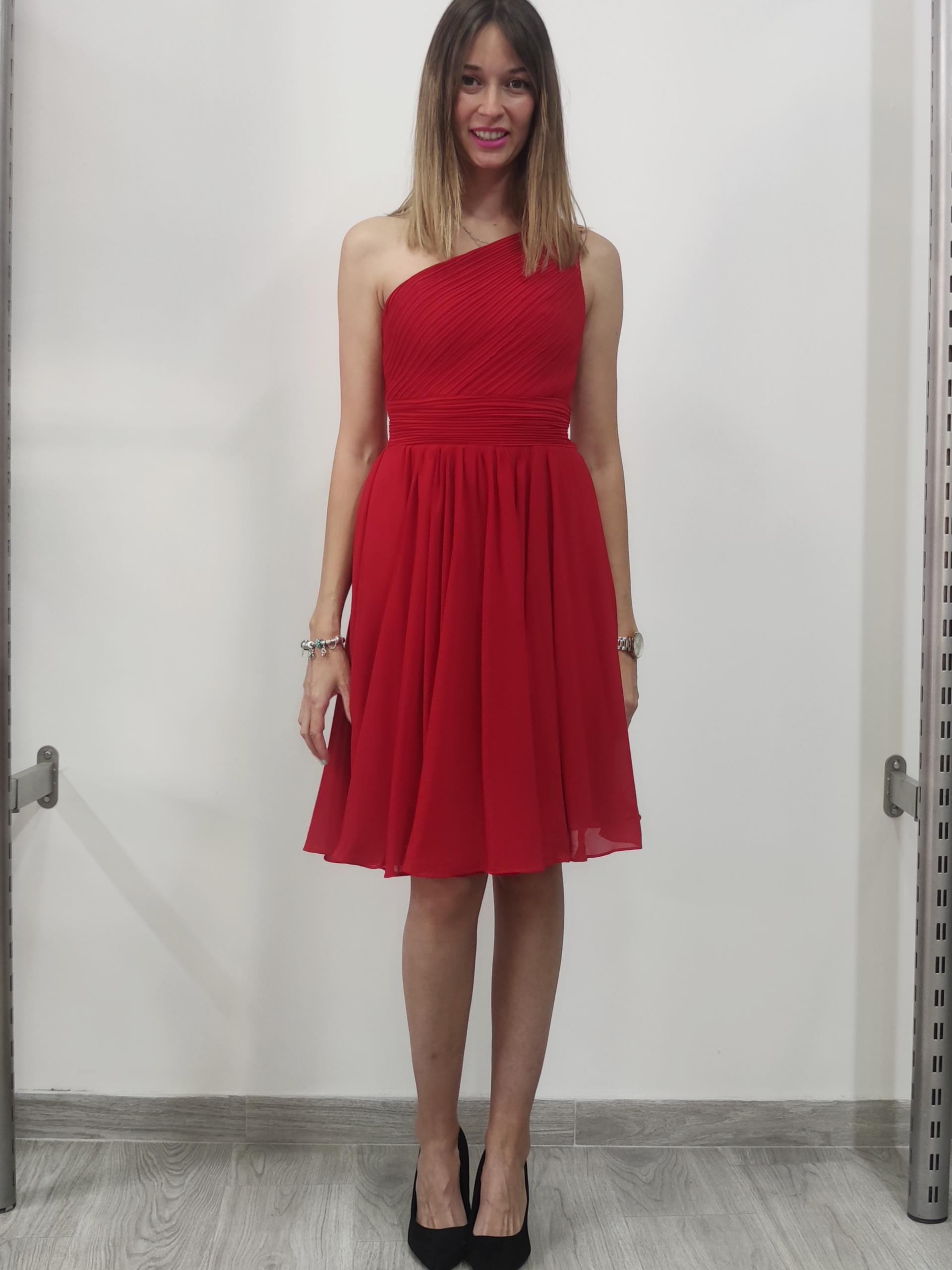 Vestido de gasa corto, con escote asimétrico, de cuerpo fruncido y entalle también fruncido, falda de vuelo. espalda engomada. Ideal para graduaciones, comuniones y otros eventos