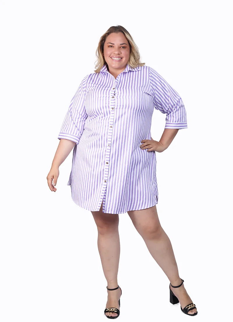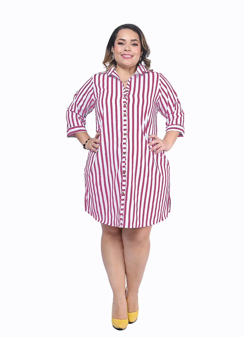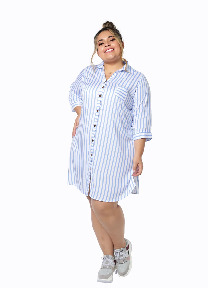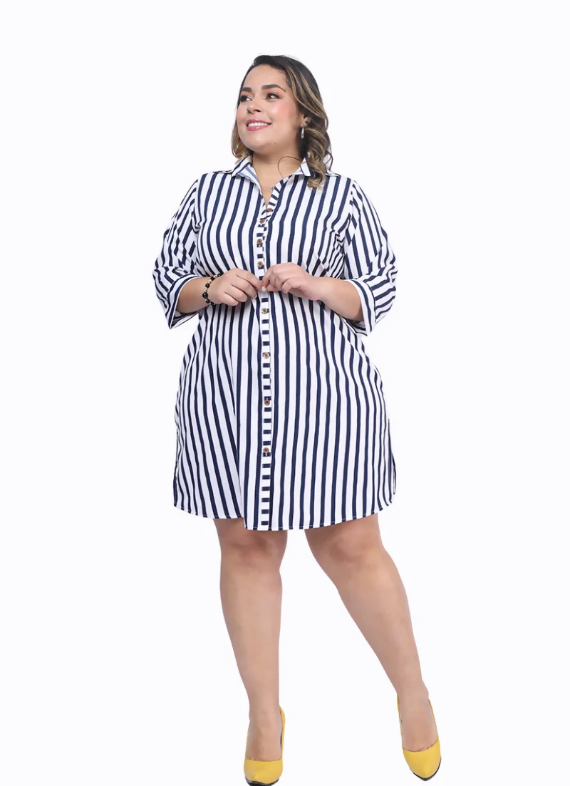 El cuello camisero y los botones funcionales son elementos clásicos que aportan versatilidad al diseño. De igual manera, las charreteras en las mangas le añaden un toque moderno y sofisticado, ideal para quienes siguen las tendencias de moda para gorditas. Este vestido se puede combinar fácilmente con accesorios llamativos o complementos discretos para adaptarlo a diferentes estilos y ocasiones.