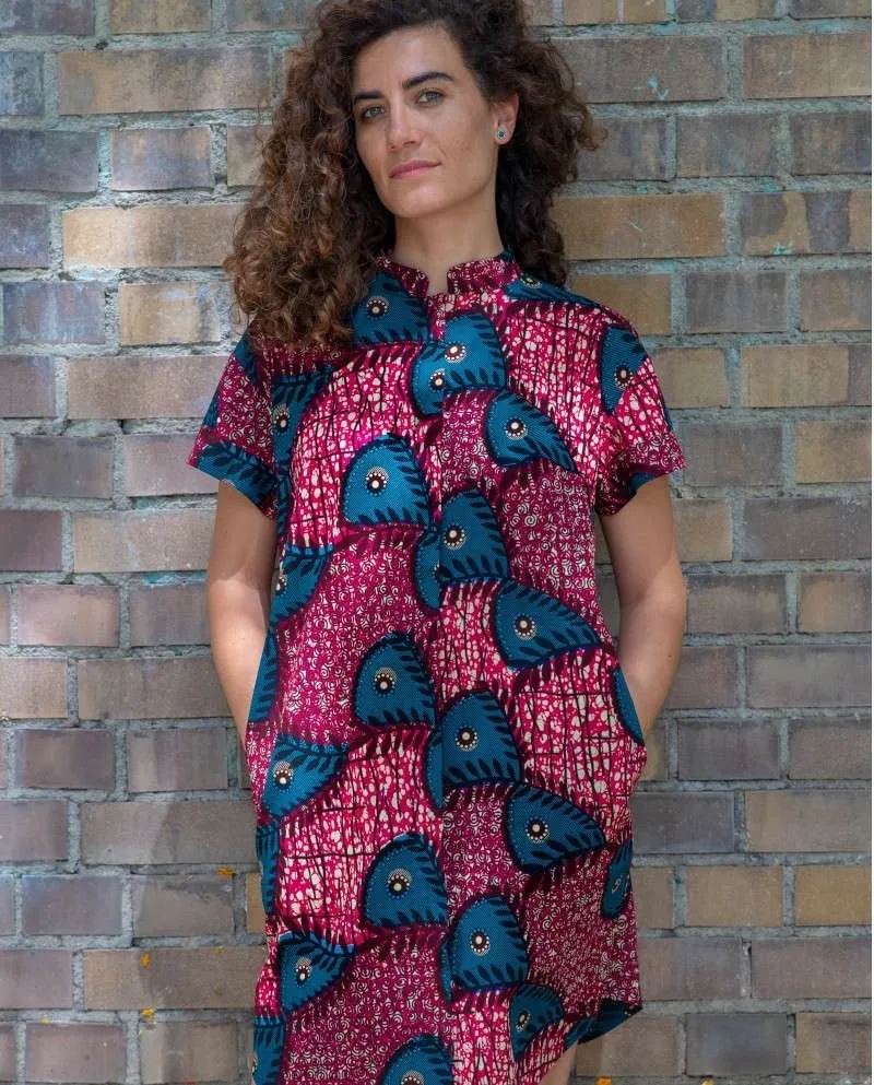 Vestido camisero recto con cuello mao, manga corta y bolsillos laterales invisibles.