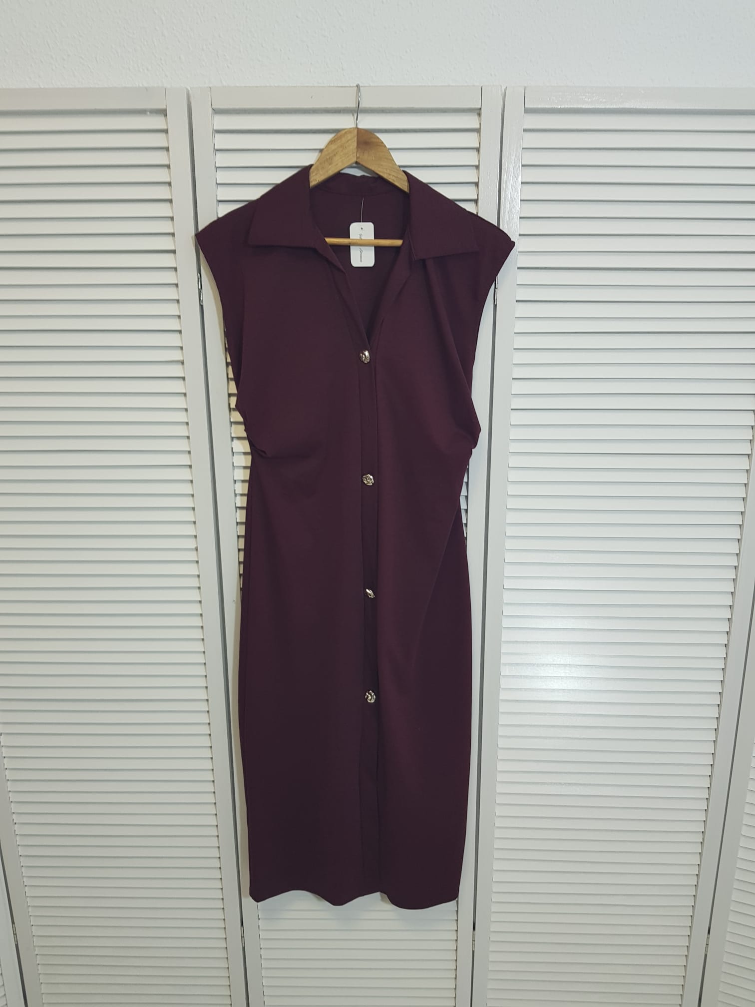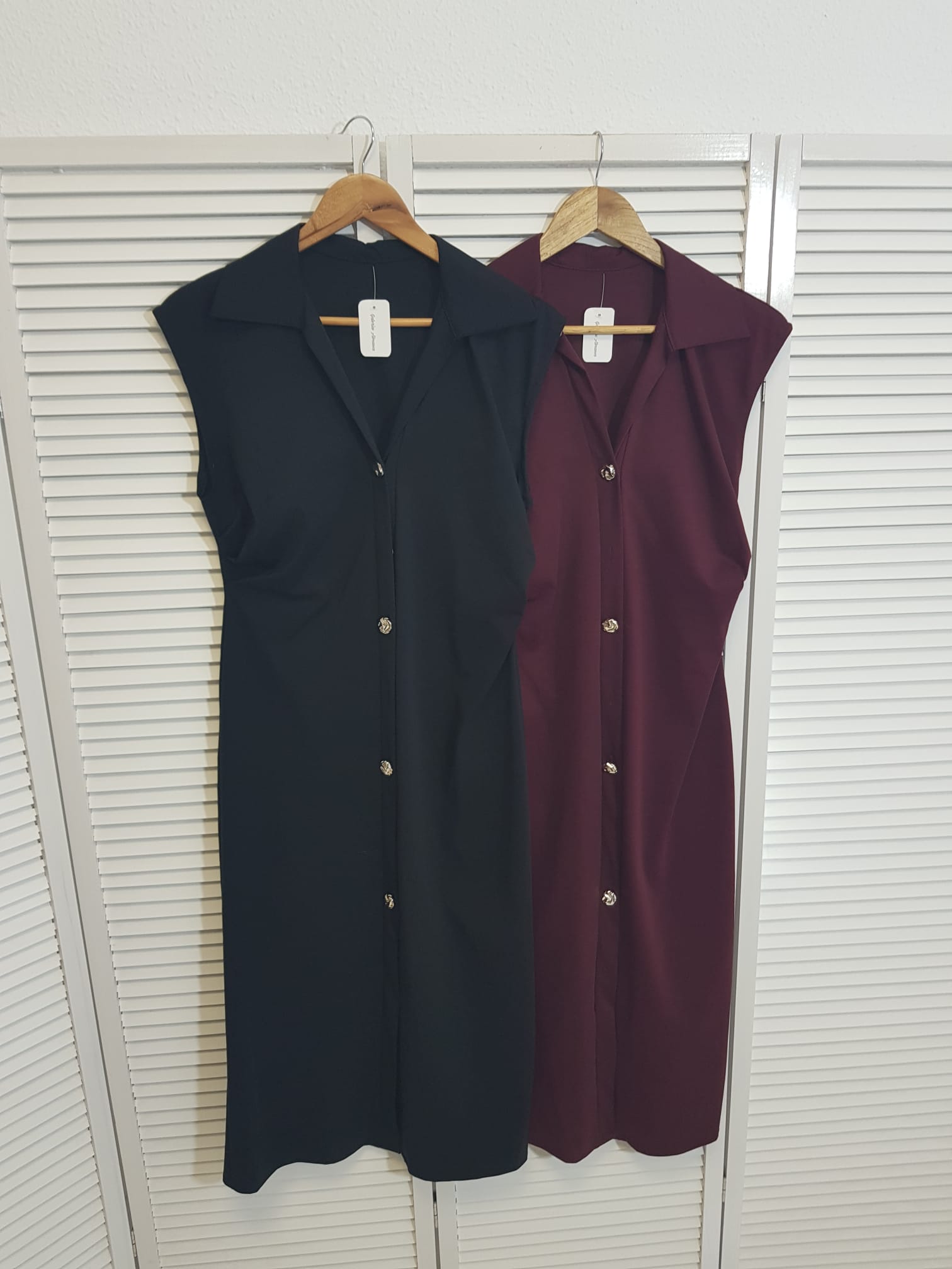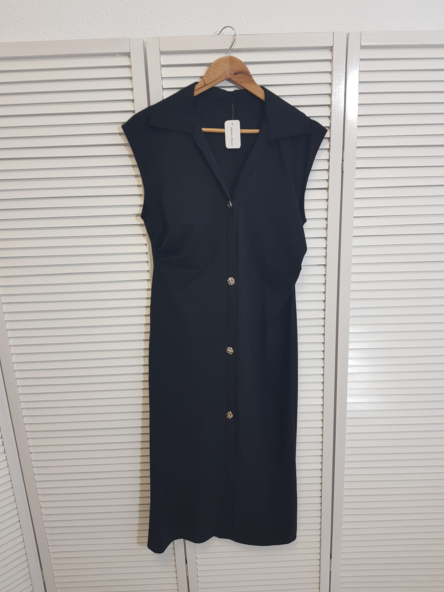 Vestido largo, elástico, entallado y abotonado por la parte delantera, cuello camisa y drapeado en la cintura.