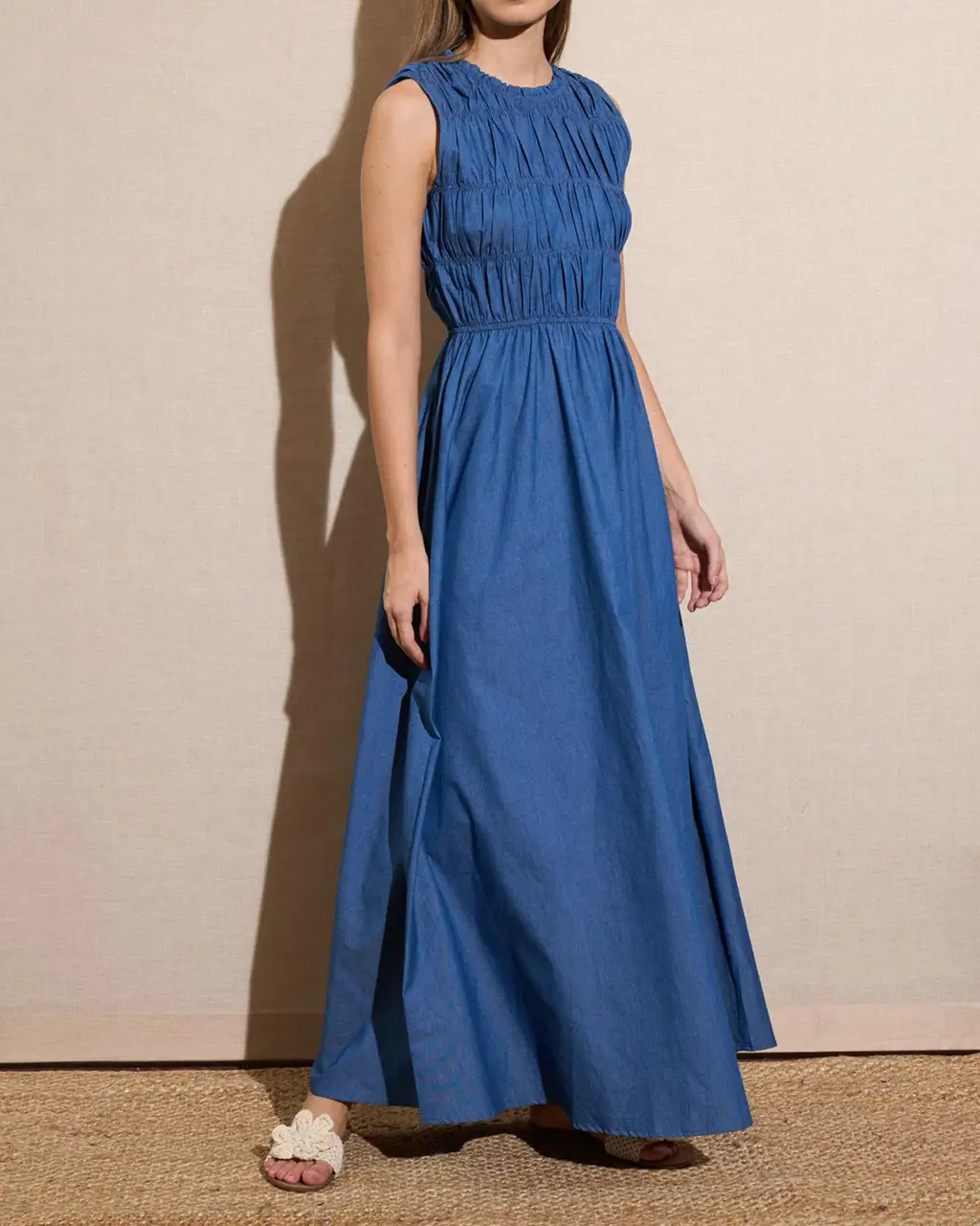 Bonito vestido vaquero en tono azul oscuro. Vestido largo sin mangas con cuello redondo y pliegues en la parte superior.